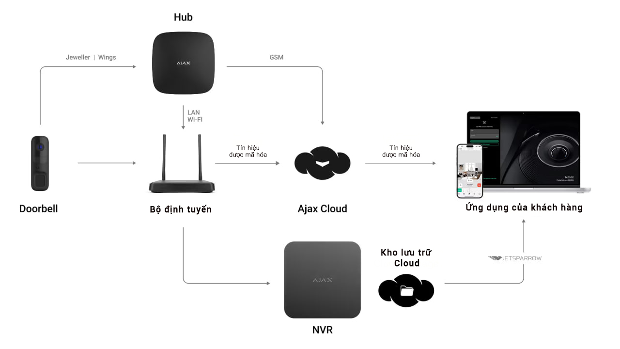 Tuy nhiên, các thiết bị Ajax không phụ thuộc hoàn toàn vào Wi-Fi - một công nghệ vốn dễ bị tấn công. Ngay cả khi Wi-Fi gặp sự cố, DoorBell vẫn tiếp tục giám sát khu vực cửa ra vào. Khi kết nối với trung tâm điều khiển Ajax, DoorBell có thể hoạt động qua kênh liên lạc dự phòng. Thiết bị sử dụng giao thức Jeweller để truyền tải sự kiện và báo động, trong khi giao thức Wings đảm bảo gửi dữ liệu hình ảnh đến ứng dụng Ajax. Cả hai giao thức độc quyền này đều có cơ chế phát hiện nhiễu sóng và gây nhiễu, cùng với công nghệ chuyển tần số tự động để tăng cường bảo mật.
