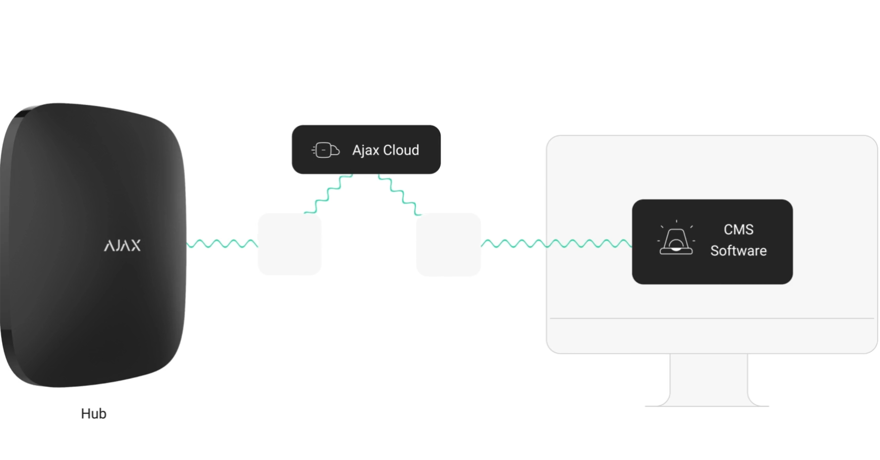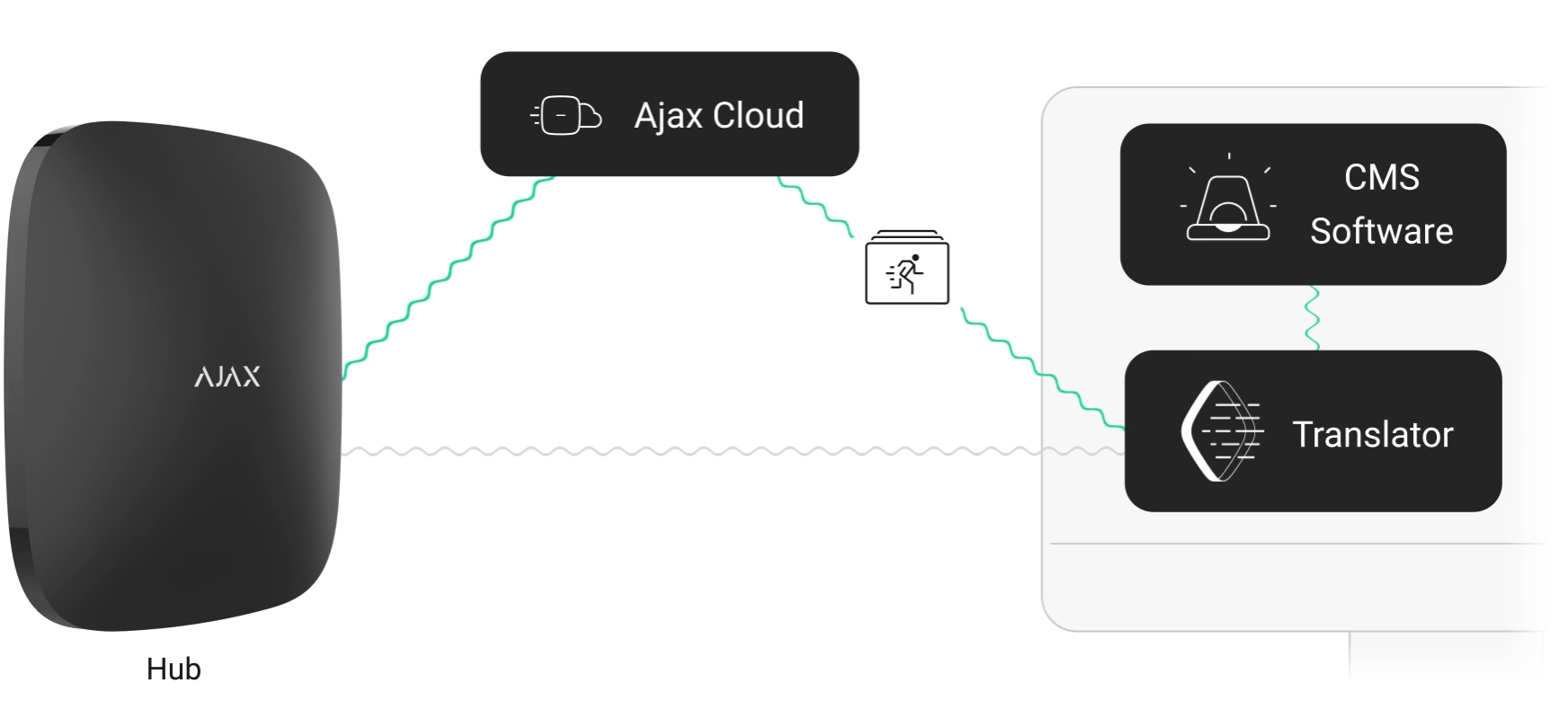 Các hub (bảng điều khiển) có thể giao tiếp với Translator trực tiếp hoặc thông qua máy chủ Ajax Cloud. Với khoảng thời gian kiểm tra 10 giây, máy chủ phát hiện mất liên lạc với hệ thống an ninh chỉ trong một phút. Bất kể phương pháp kết nối nào, dữ liệu truyền đi đều được mã hóa.