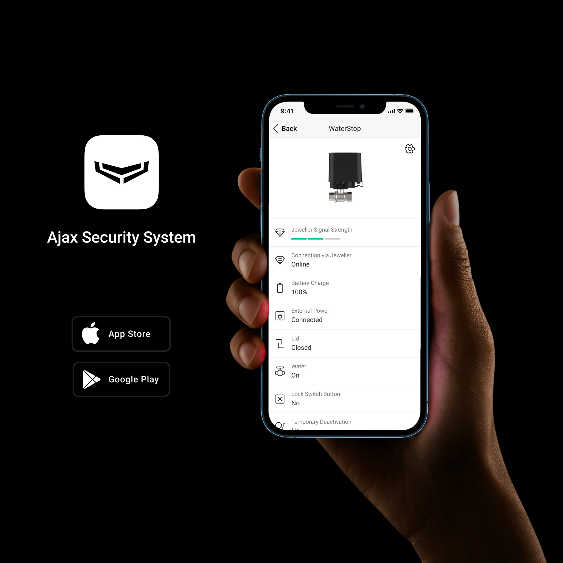 Ajax WaterStop được trang bị mô-tơ điện có mô-men xoắn lên đến 8.5 N•m, đủ mạnh để khóa cả những van nước bị kẹt mà không gây hư hỏng. Trong điều kiện tiêu chuẩn (ống nước ¾ inch, áp suất 2.5 bar), van sẽ khóa nước chỉ trong 7 giây, giới hạn lượng nước rò rỉ dưới 1 lít.