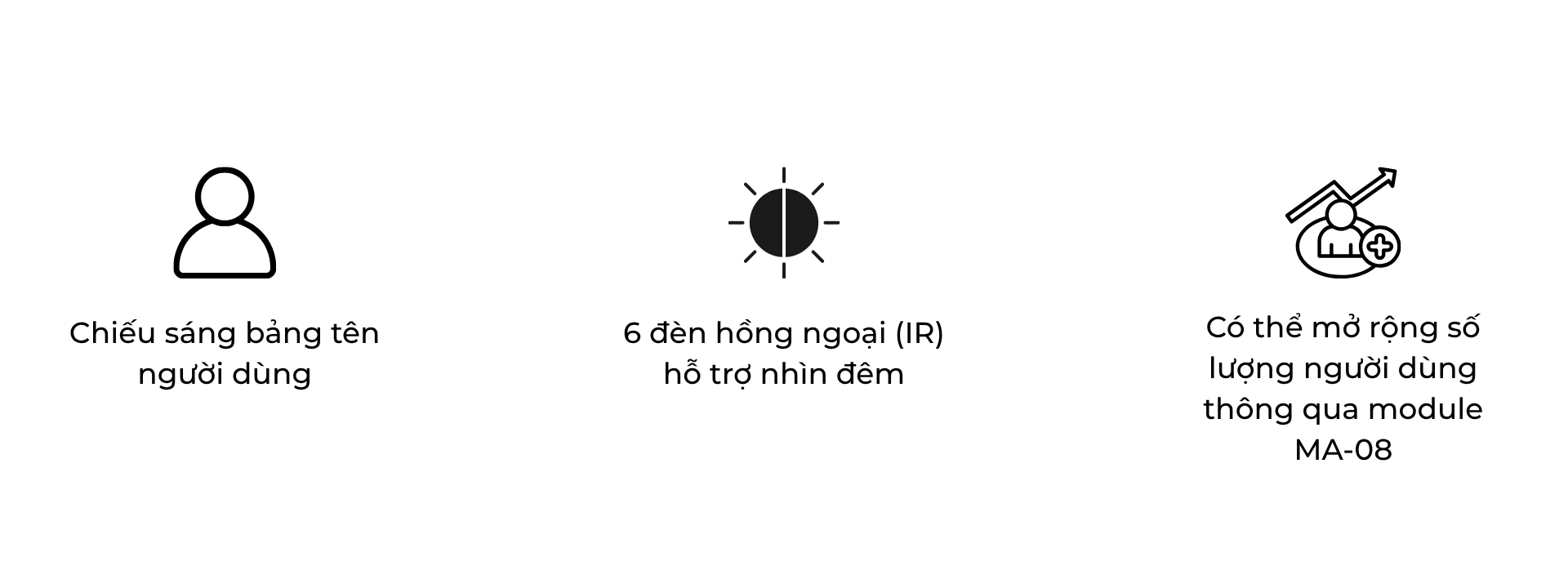 - Tính năng đặc biệt: Chiếu sáng bảng tên người dùng, tích hợp 6 đèn hồng ngoại (IR) hỗ trợ quan sát ban đêm, có thể mở rộng số lượng người dùng thông qua module MA-08